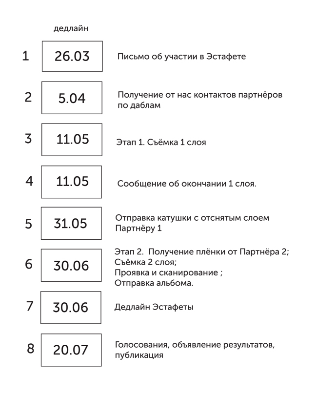 Каждый участник эстафеты снимает в общей сложности 2 плёнки даблов с двумя другими фотографами. Все партнёры для даблов будут определяться почти случайным образом, разве что постараемся хоть как-то учесть опыт и город, чтобы было интереснее, и камеру (для лучшего совпадения кадров, но не будем обещать, что получится так подобрать) Механика: Вот схематично, далее подробно: