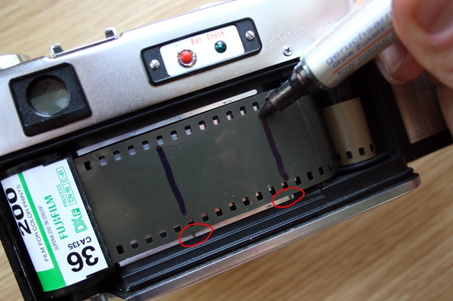 Стоит правильно отмечать границы первого кадра, чтобы ваш партнёр правильно зарядил плёнку и ровненько попал кадр-в-кадр. Отмечать лучше всего боковые границы кадра, когда вы до упора взвели затвор, примерно так: