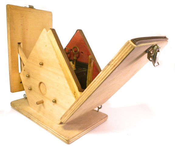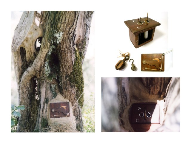 Я использовал пленку 120 типа, для ее продвижения я использовал два старых ключа. Пленка была помещена внутрь небольшого деревянного черного короба. Ключи торчали сверху короба, так что я легко мог управлять движением пленки. Я снабдил скворечник деревянным затвором, привязанным веревкой, поэтому мог осуществлять дистанционное управление. Я закрепил затвор на передней стенке скворечника с круглым отверстием, так что все мои кадры получали круглую форму. Я сделал так, чтобы показать, собственно, мою идею. Фотографии должны были быть сняты изнутри птичьего дома, будто бы глазами птицы.
