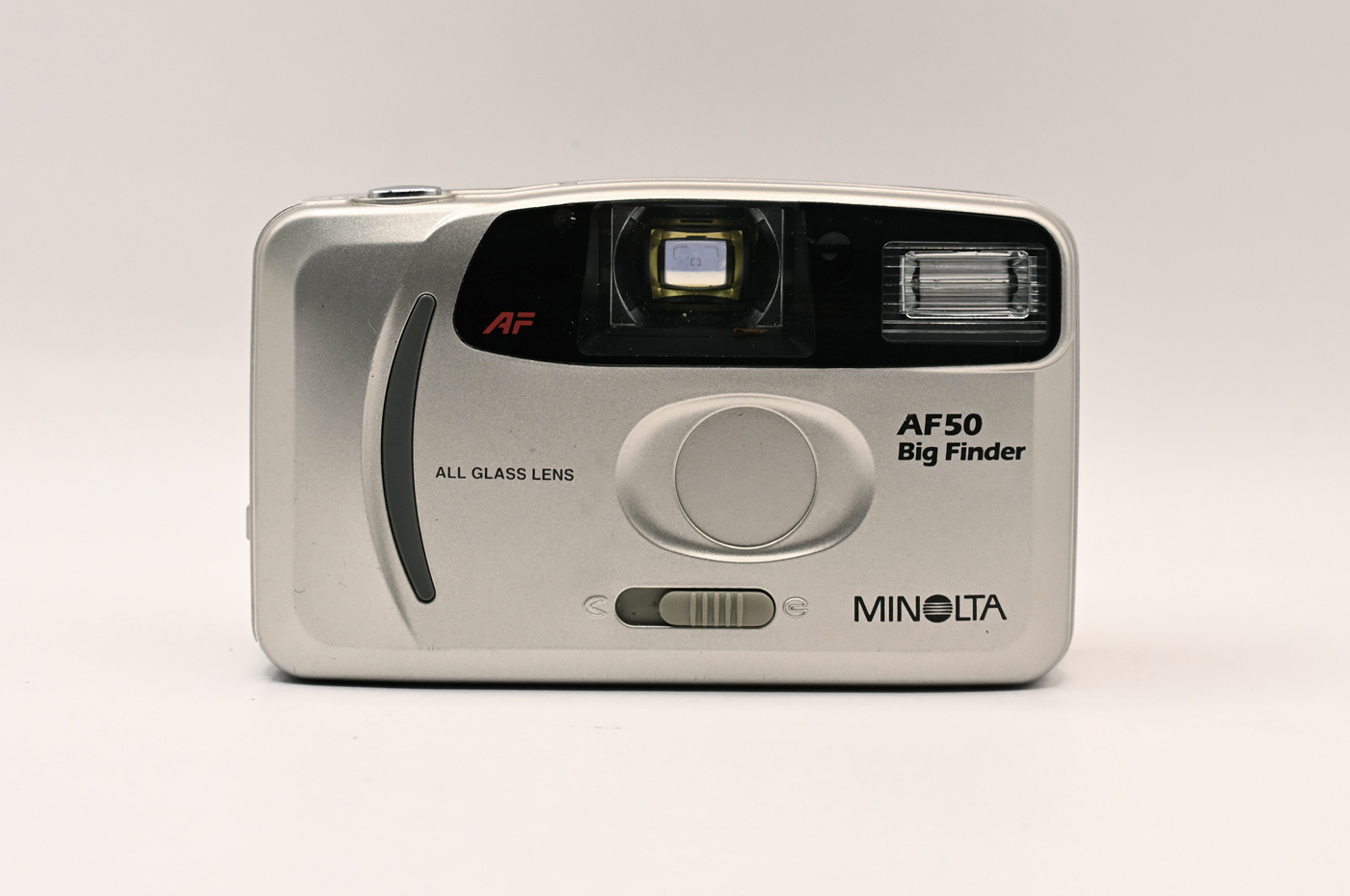Пленочный фотоаппарат Minolta AF 50 Big Finder - в полностью рабочем и очень хорошем внешнем состоянии (имеются незначительные потертости на корпусе, немного пыли в ввидоискателе), на 14-дневной гарантии магазина Фокус. В данный момент в наличии в единичном экземпляре, купить этот удобный и умный пленочный фотоаппарат можно в нашем фотомагазине в Петербурге или онлайн с удобной доставкой.